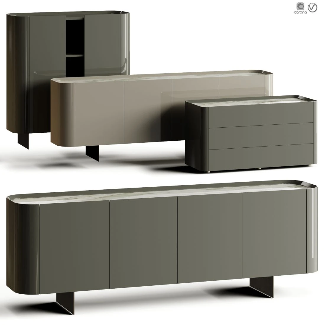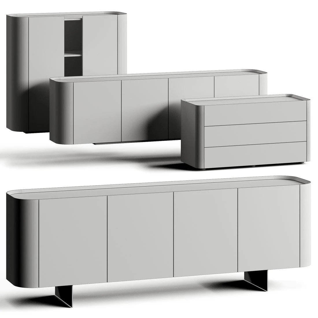 Коллекция включает комоды, сайдборды и шкафы с характерными скруглёнными торцами и чистой монолитной геометрией. Дизайн ориентирован на актуальные интерьерные решения: modern, contemporary, luxury minimal, soft minimal.