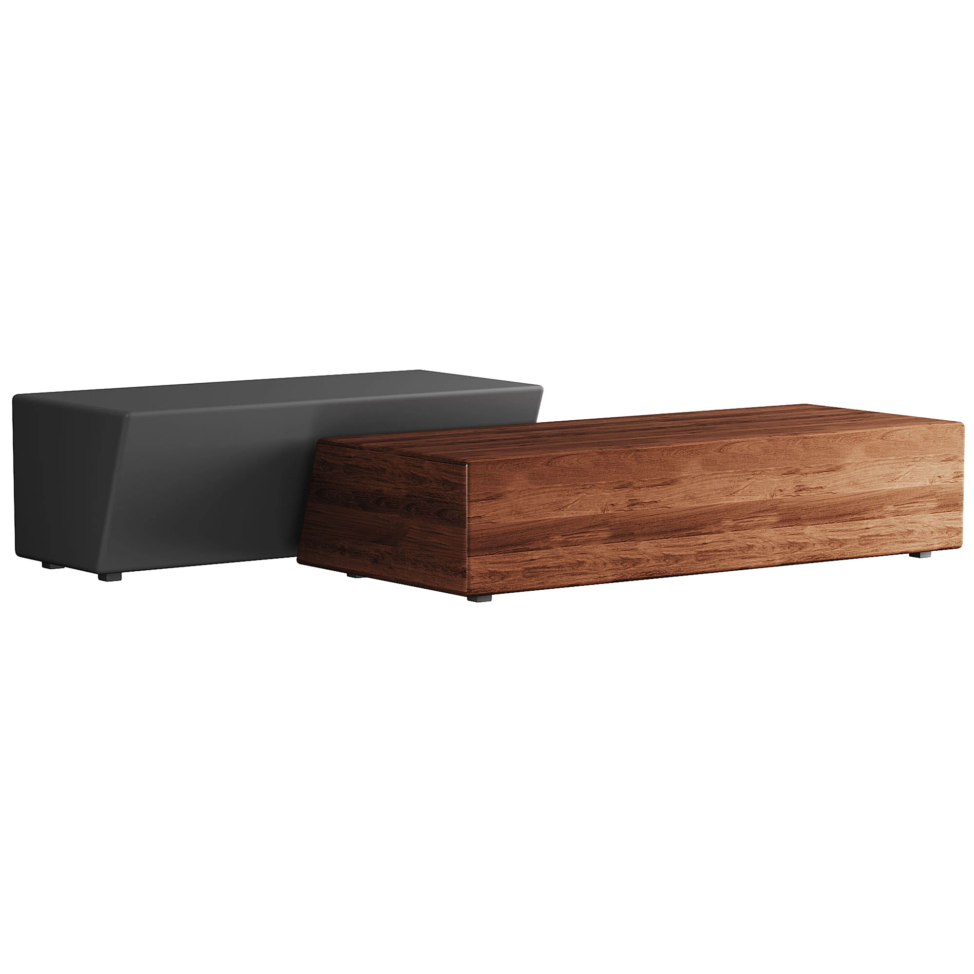 Современный дизайнерский журнальный стол, выполненный в минималистичной геометрии с выразительными массивными формами. Модель сочетает строгие прямые линии и лаконичный дизайн, что делает ее стильным акцентом современного интерьера. В наборе представлены два варианта столика с разными размерами и отделками, включая текстуру натурального дерева и матовые поверхности.