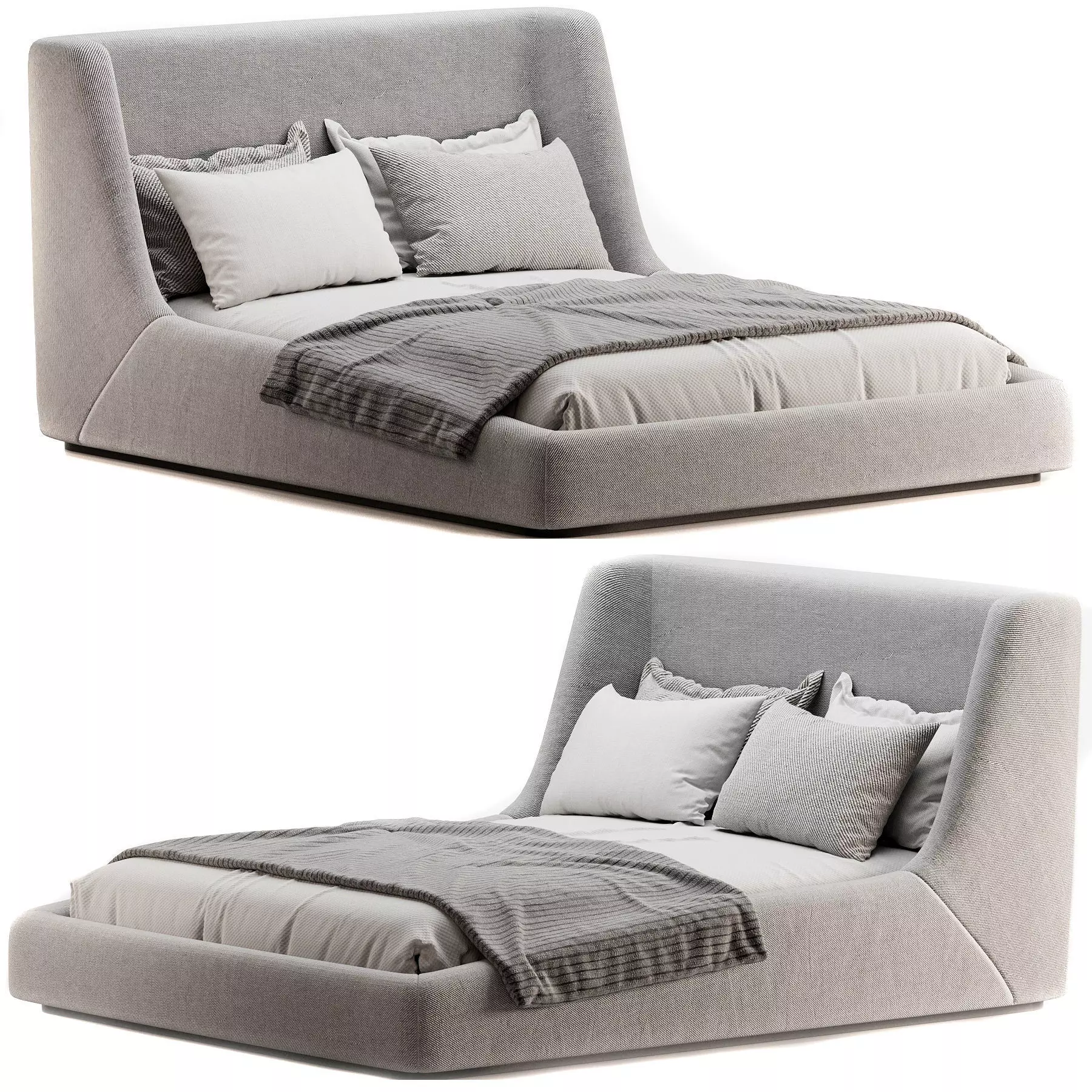Современная двуспальная кровать с мягким текстильным изголовьем плавной формы и цельным низким основанием. Модель выполнена в нейтральном оттенке fog с аккуратной драпировкой постельных принадлежностей и декоративными подушками, что делает её готовым решением для интерьерной визуализации спальни.