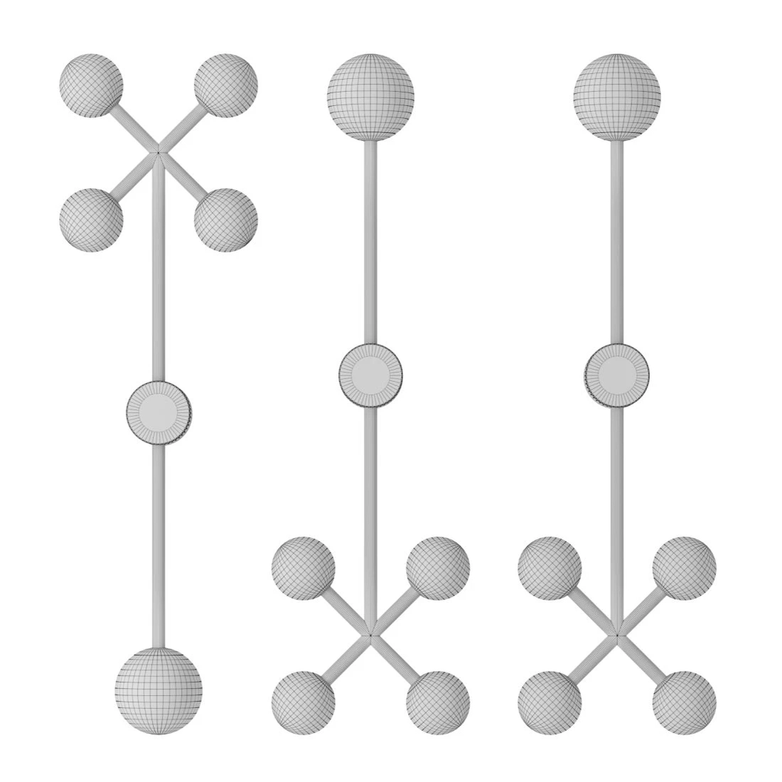 Настенный светильник с выразительной геометрической композицией. Модель состоит из вертикальной стойки и нескольких сферических плафонов, расположенных на перекрестных элементах, создающих динамичную и современную форму.