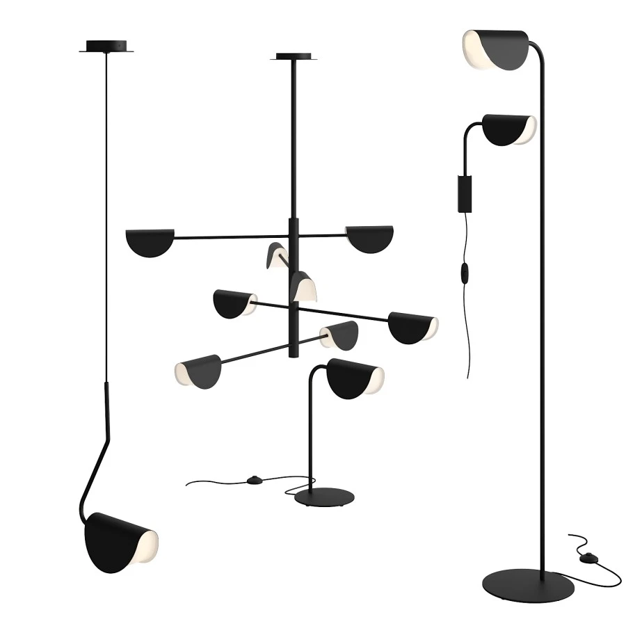 Набор светильников Mollis в едином современном стиле: подвесная люстра, торшер и настольная лампа. Лаконичная графичная геометрия, тонкие металлические штанги и полусферические плафоны с контрастной внутренней поверхностью формируют выразительный силуэт и мягкий направленный свет.