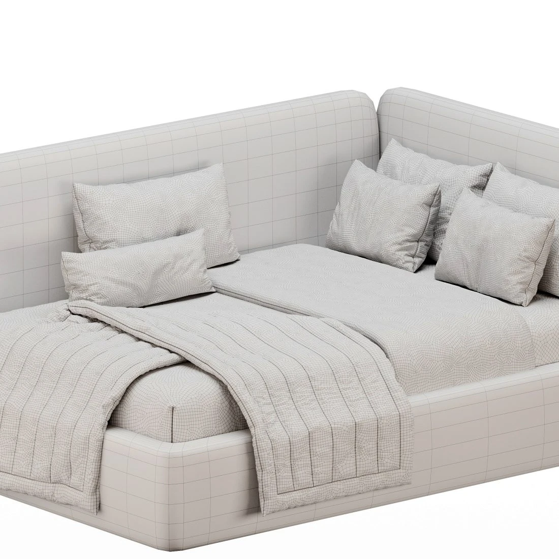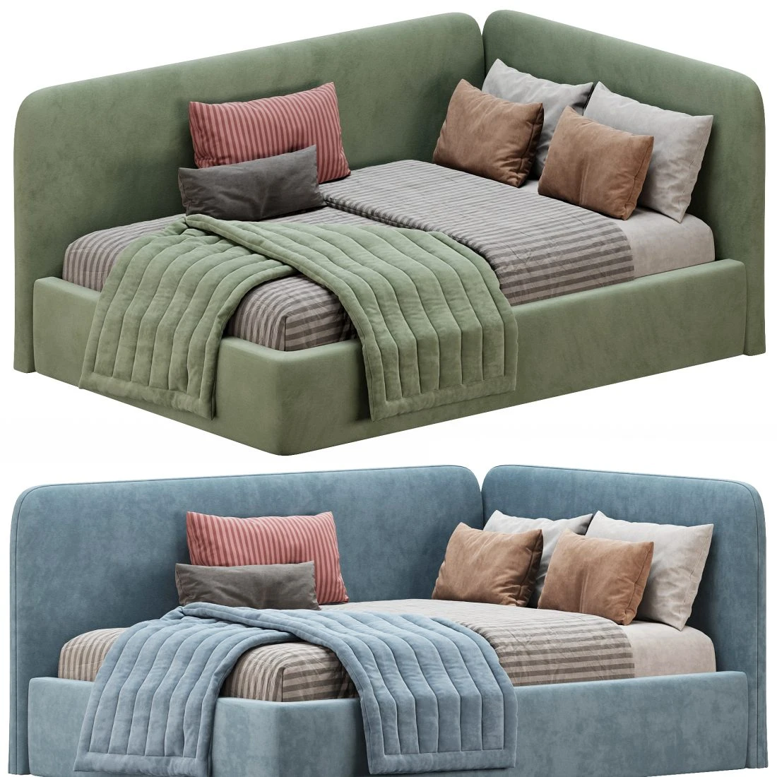 3D-модель детской угловой кровати с мягким цельным изголовьем, создающим защищённое, комфортное пространство. Конструкция выполнена в обивке с плотной текстурой, формы округлённые и безопасные для использования в детских комнатах. Модель представлена в двух цветовых вариантах и включает полный комплект текстиля: подушки разного размера, декоративные подушки, покрывало и стёганный плед.