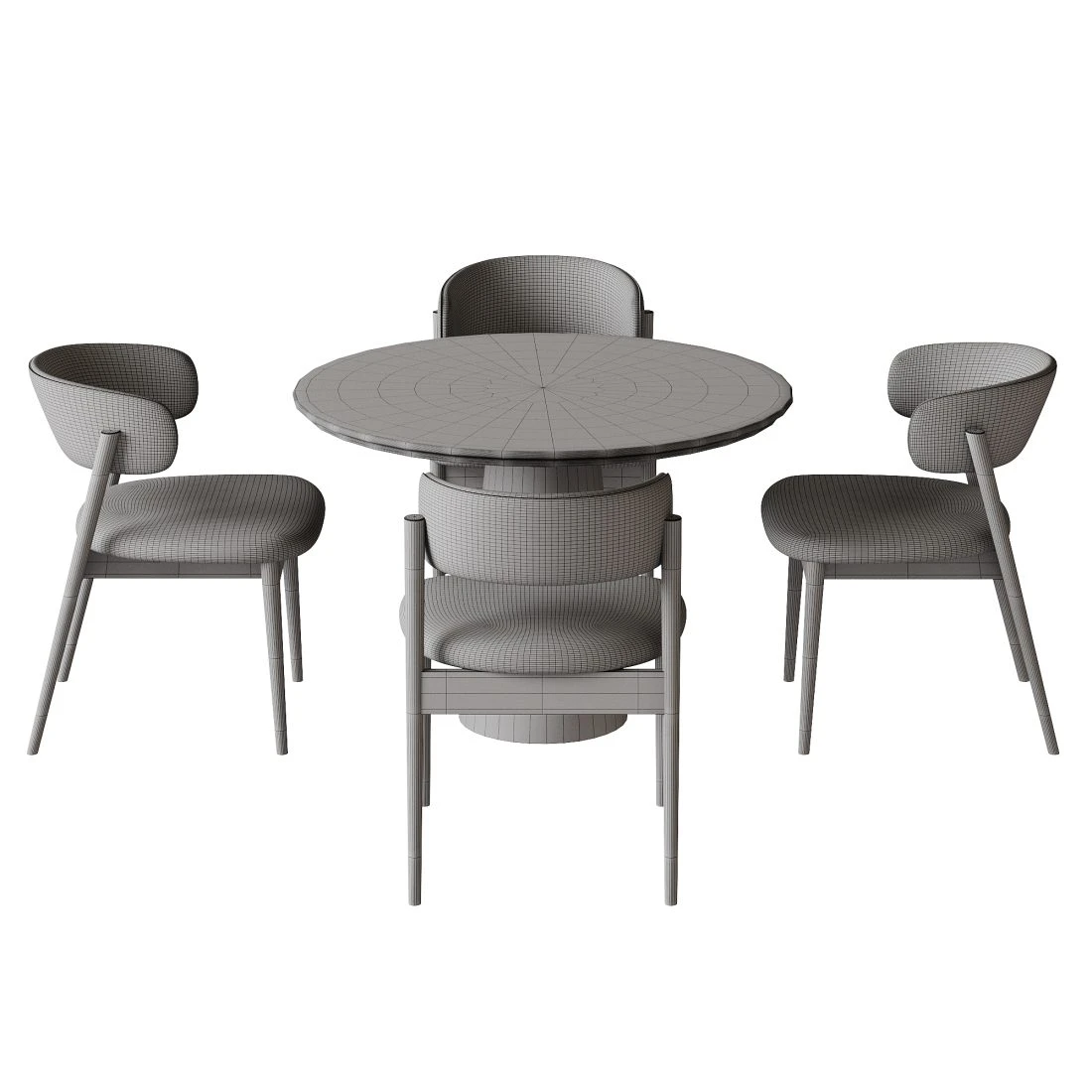 3D-модель обеденной группы Dining Set 2, включающая круглый стол и четыре обеденных стула. Дизайн выдержан в современной скандинавской эстетике: мягкие округлые формы, спокойная геометрия и натуральные пропорции делают комплект универсальным решением для жилых и общественных интерьеров.