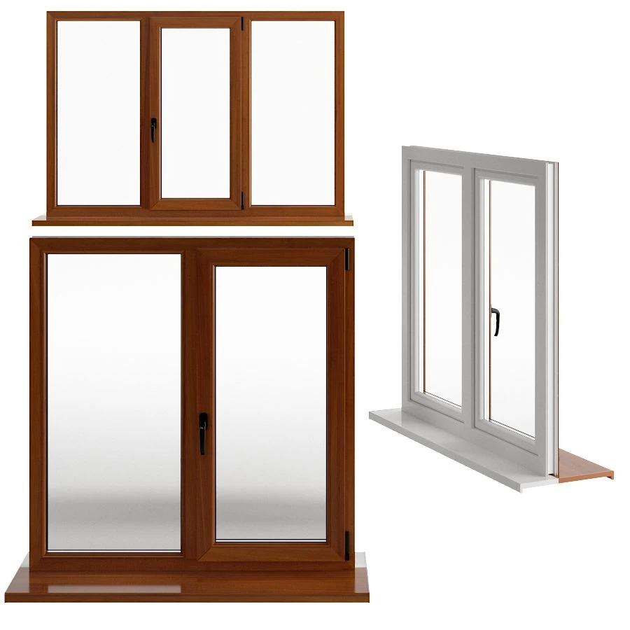 Комплект оконных и балконных блоков Rehau с реалистичной текстурой под дерево. Модель включает несколько конфигураций: поворотные створки, глухие секции, балконную дверь и варианты комбинированных оконных систем.
